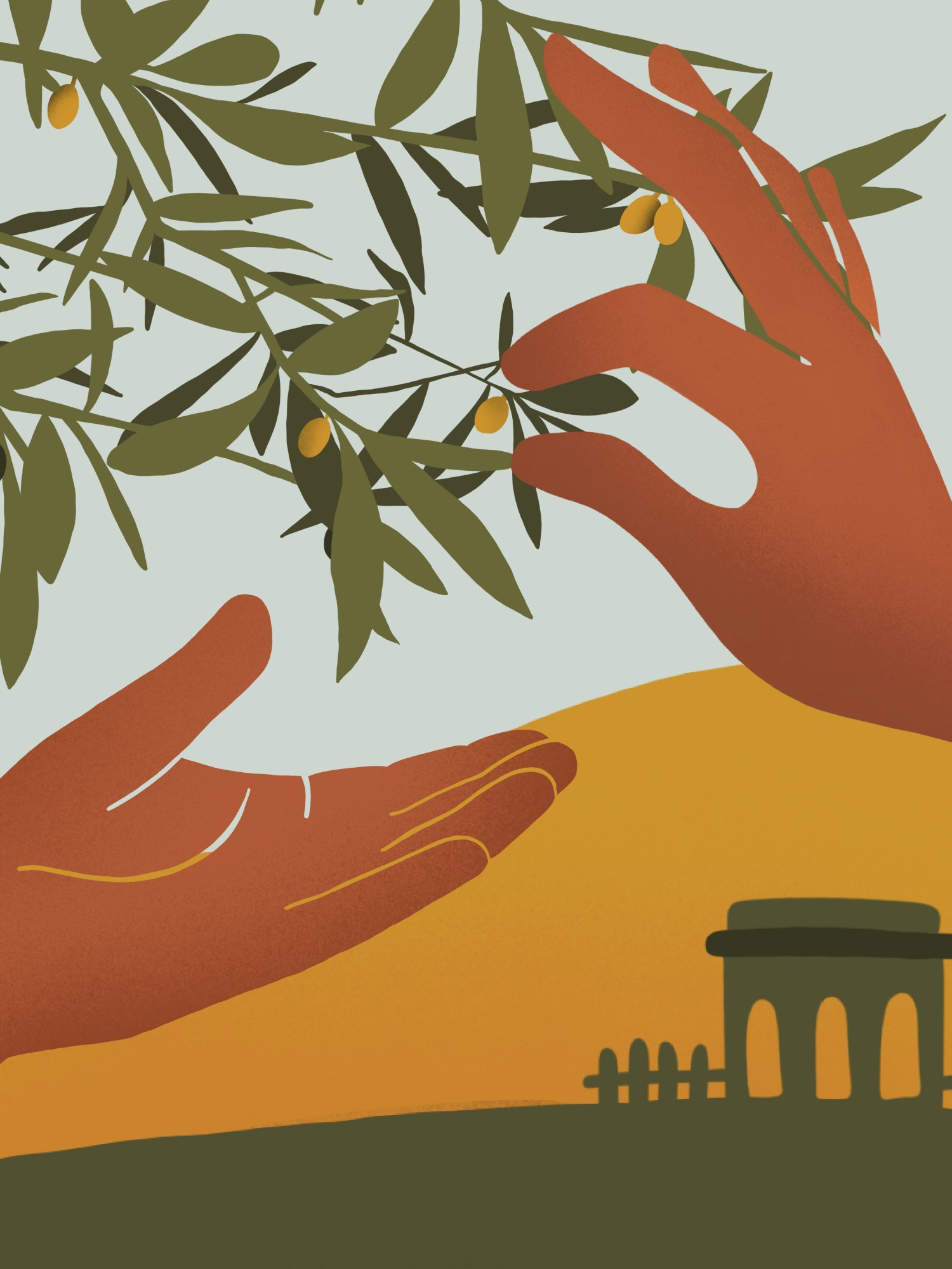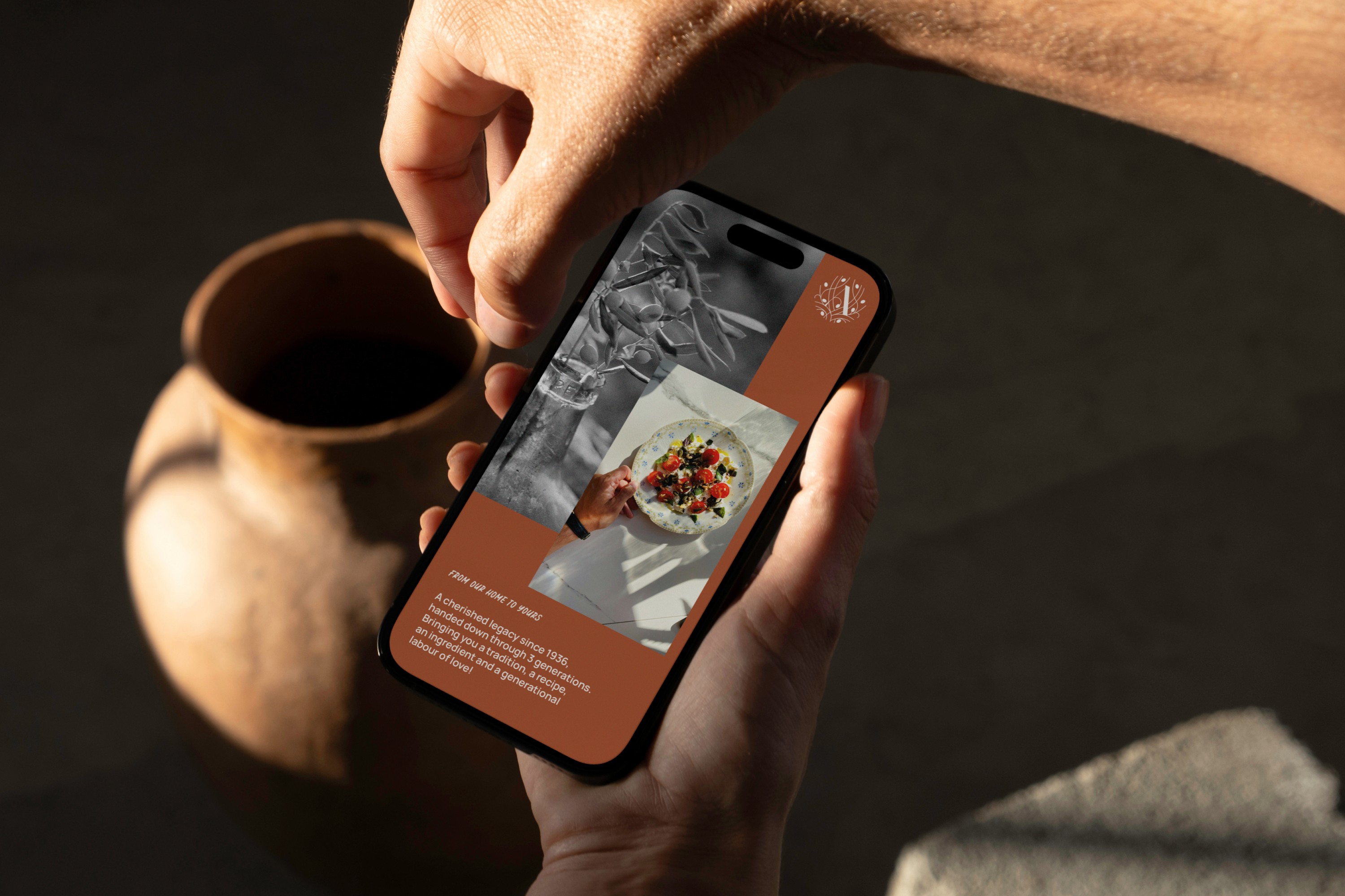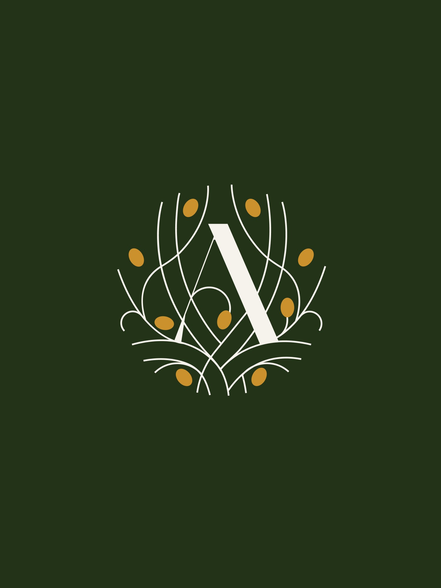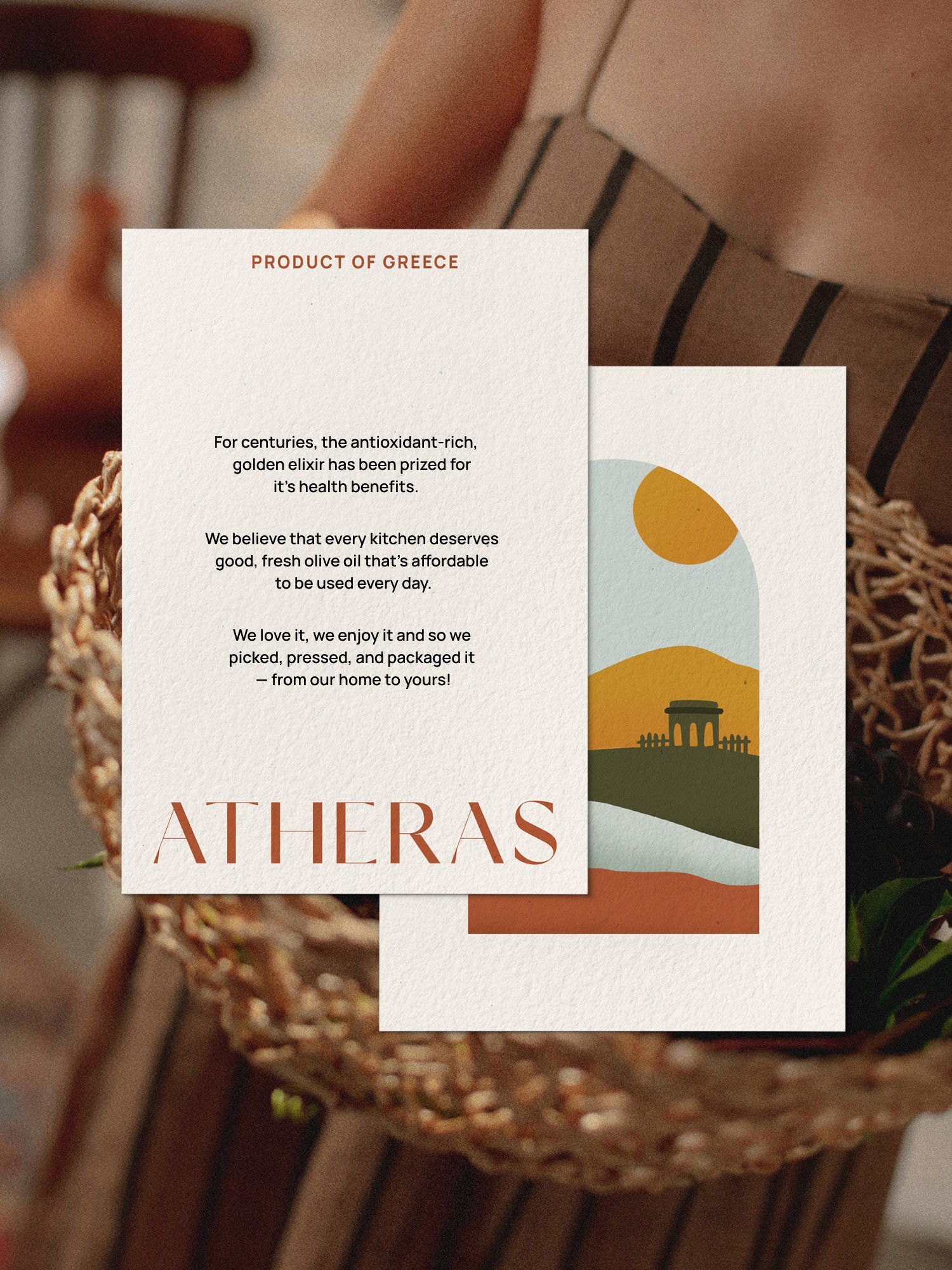 The visual identity aims to enhance a classic and traditional design with a poetic touch. The goal is to elevate the brand's values of elegance, purity, and tradition. The illustration depicts a sunset scene with subtle Greek architectural elements, while the colour palette draws inspiration from natural and earthy tones such as soil, olive green, and sky blue. The result is a recognisable system, with a tiny hint of what brings us back home.