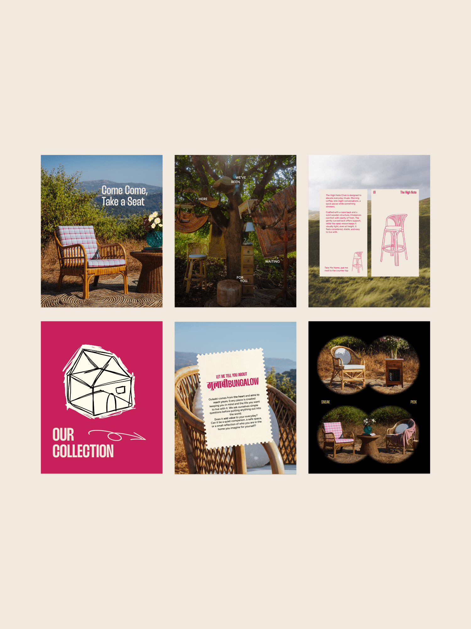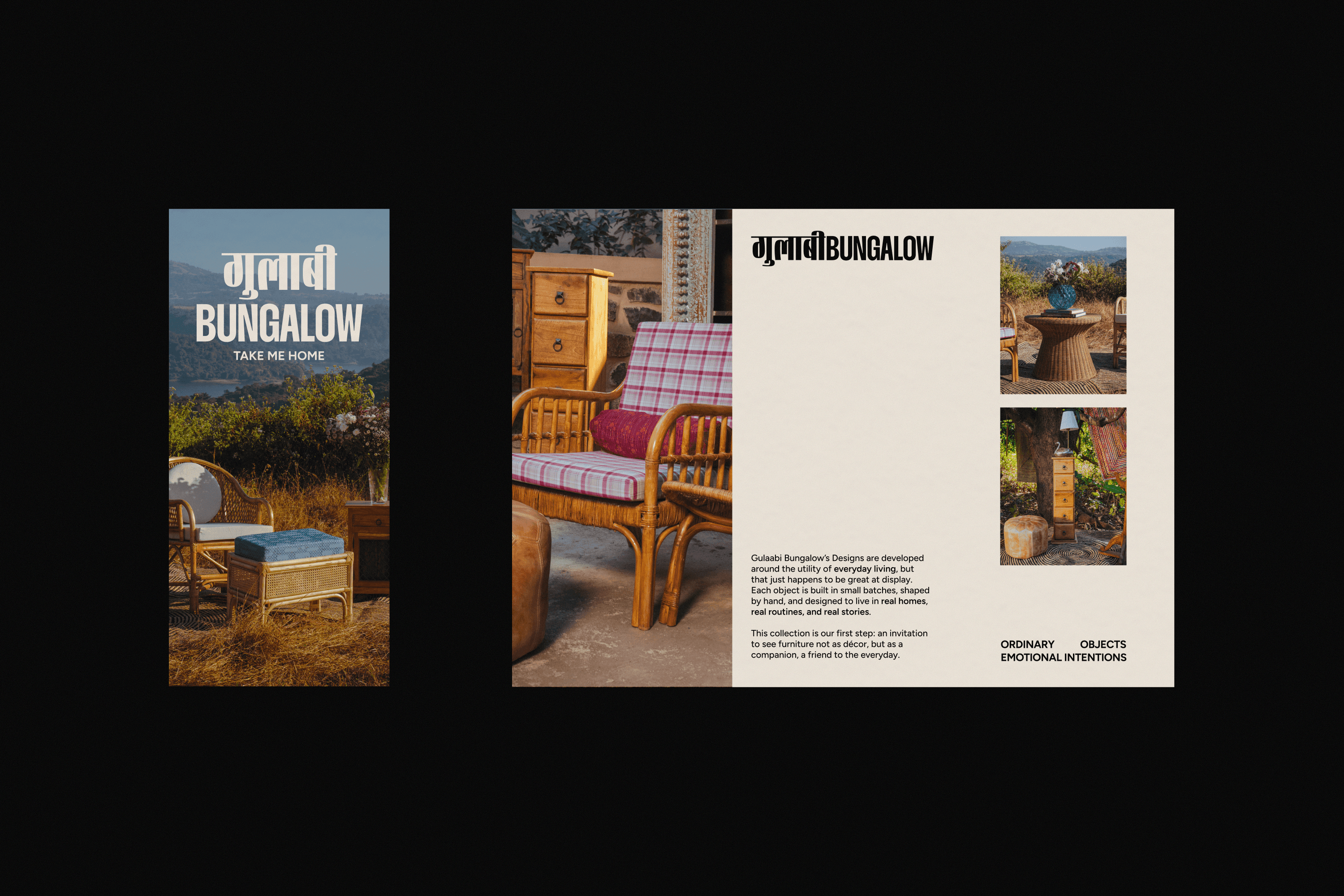 The identity for Gulaabi Bungalow draws from the warmth and character of layered Indian homes. Inspired by the charm of everyday living, the visual language combines bold typography, vibrant colours, playful messaging, and hand-drawn illustrations to create a brand that feels expressive and full of personality. The system celebrates furniture not just as objects, but as part of lived-in spaces, where stories unfold, comfort grows, and individuality is welcomed.